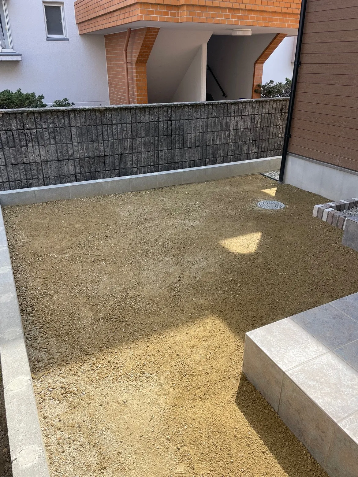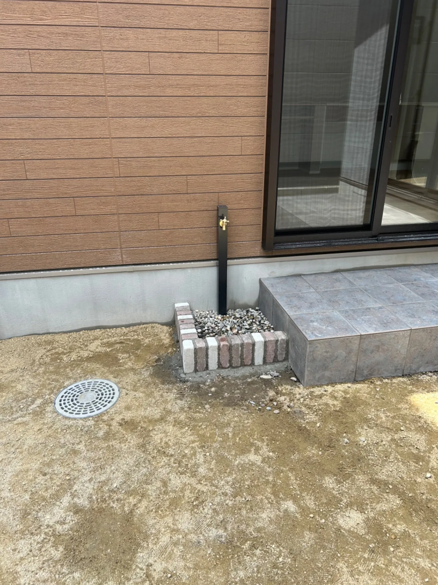 タイルテラス、立水栓、洗い場(レンガコバ建て)山砂仕上げ。